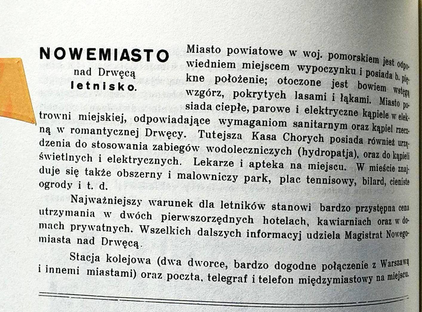 „Miasto powiatowe w woj. pomorskiem jest odpowiednim miejscem wypoczynku i posiada bardzo piękne położenie, otoczone jest bowiem wstęgą wzgórz, pokrytych lasami i łąkami. Miasto posiada ciepłe, parowe i elektryczne kąpiele w elektrowni miejskiej, odpowiadające wymaganiom sanitarnym oraz kąpiel rzeczną w romantycznej Drwęcy. Tutejsza kasa chorych posiada również urządzenia do stosowania zabiegów wodoleczniczych (hydroterapia) oraz do kąpieli świetlnych i elektrycznych. Lekarze i apteka na miejscu. W mieście znajduje się także obszerny i malowniczy park , plac tenisowy, bilard, cieniste ogrody i.t.d. Najważniejszy warunek dla letników stanowi bardzo przystępna cena utrzymania w dwóch pierwszorzędnych hotelach, kawiarniach oraz domach prywatnych. Wszelkich dalszych informacji udziela Magistrat Nowegomiasta nad Drwęcą. Stacja kolejowa, dwa dworce, (bardzo dogodne połączenie z Warszawą i innemi miastami) oraz poczta, telegraf i telefon międzynarodowy na miejscu”